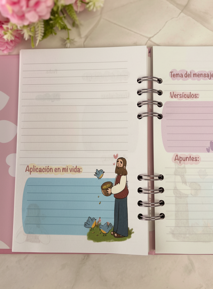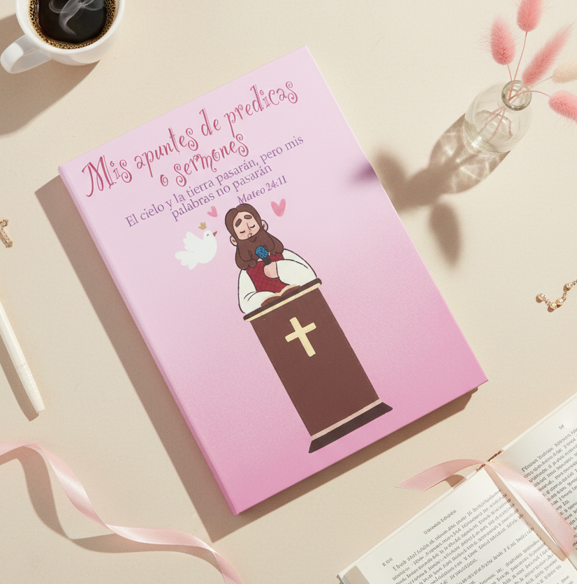 Organiza tus notas de prédicas con este hermoso cuaderno diseñado especialmente para ayudarte a registrar cada enseñanza de manera clara y ordenada. Su diseño único combina con tu Fe, para inspirarte en cada página.