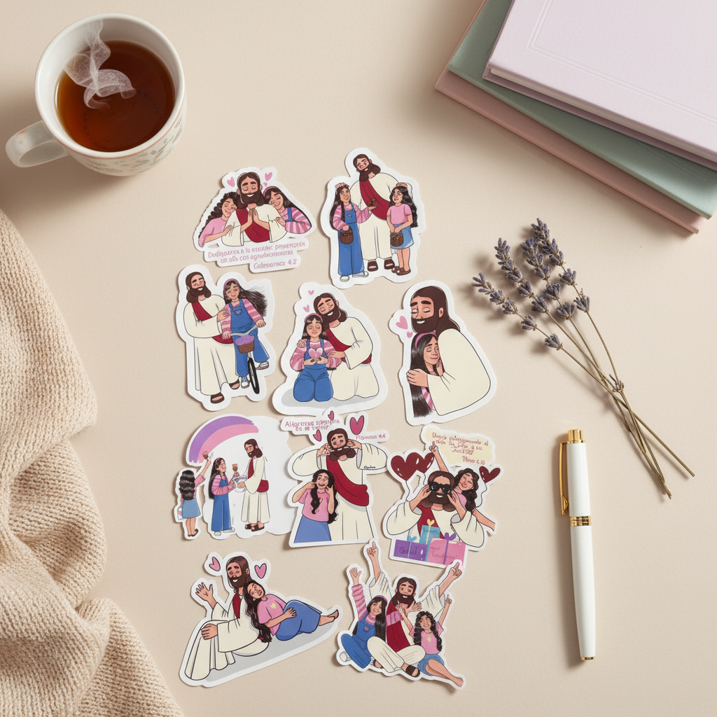 Llena tus cuadernos, diarios, agendas y tiempos devocionales con estos hermosos stickers cristianos, diseñados para inspirarte y recordarte las promesas de Dios en cada detalle de tu día.